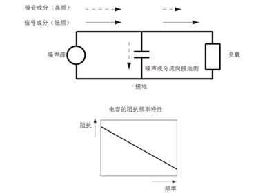 低通濾波器如果要利用該特性,就需要將電容插入噪聲通道與地線之間。如此一來,低頻信號能夠照常通過,高頻噪聲成分因接地側的阻抗較低,將流向接地側,從而達到降噪效果。